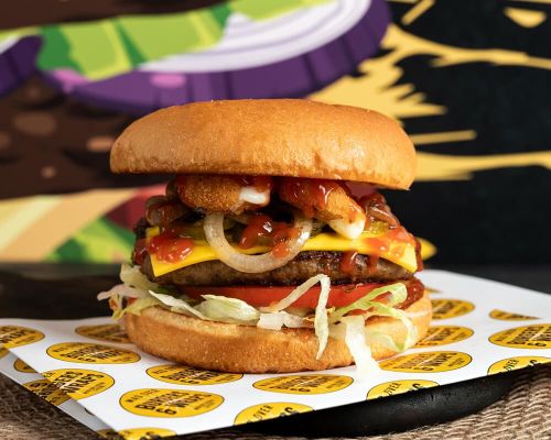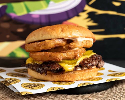 2x Smashed beef patty with American cheese, crispy fried onion rings, BandB pickles, and signature smash sauce on a toasted potato bun.
