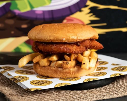 Crispy Chicken fillet, cheese, Lettuce, tomato, signature sauce on potato bun
