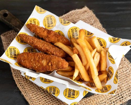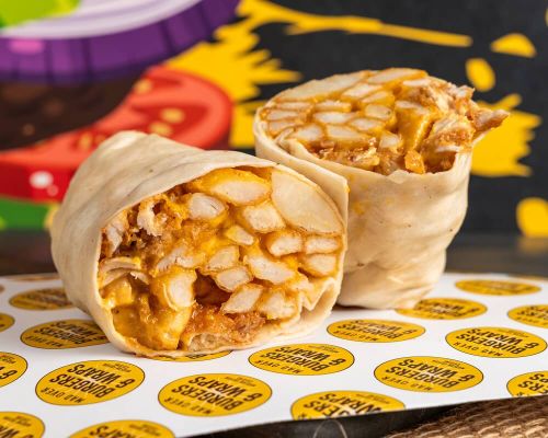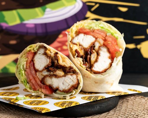 Crispy chicken fillet, crispy thick cut chips, cheese sauce, bacon, tomato, lettuce and mayo wrapped inside a delicious plain tortilla