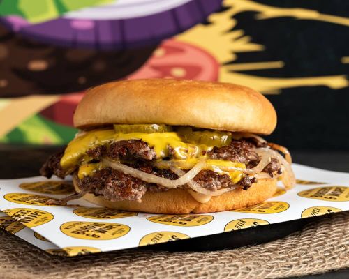 Thinly sliced onions smashed into 2x beef patty topped with American cheese, BandB pickles and signature smash sauce on toasted potato bun.