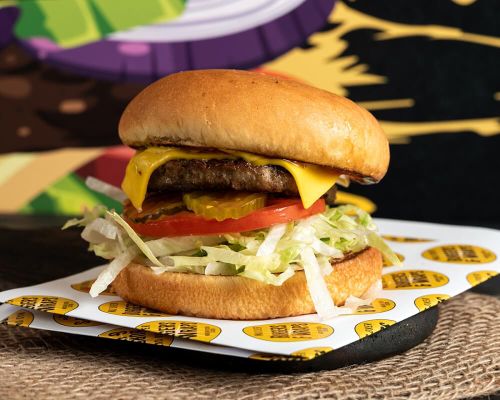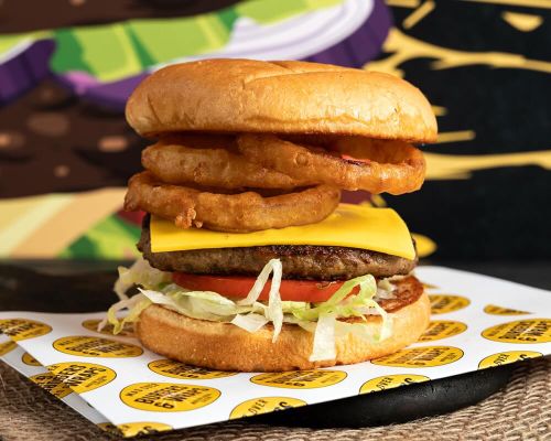 Homestyle beef patty topped with American cheese, crispy fried onion rings, tomato, lettuce and mayo on a toasted bun.