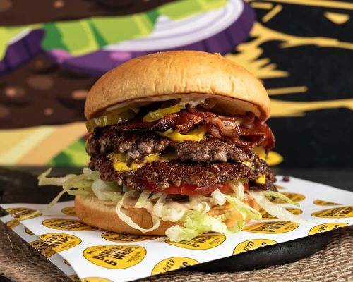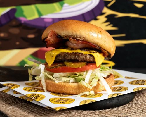 2x Smashed beef patty, grilled bacon, American cheese, BandB pickles, lettuce, tomato and signature smash sauce on a toasted potato bun.