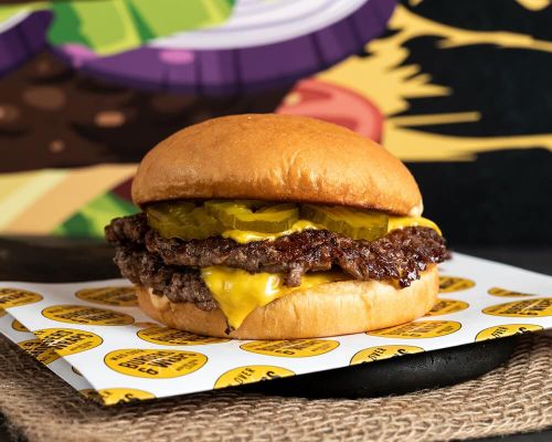 2x Smashed beef patty with American cheese, BandB pickles, and signature smash sauce on a toasted potato bun.