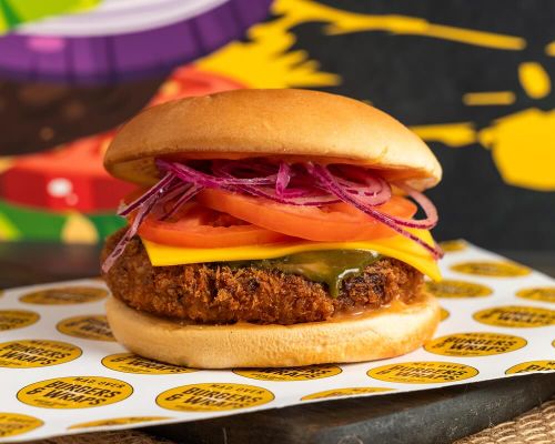 Veggie patty made of potatoes, peas and a selection of herbs topped with cheese , crispy lettuce, tomato, onion, tandoori mayo, mint sauce and tamarind sauce.