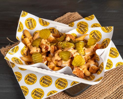 Crispy fries topped with American cheese sauce, chicken tender, Chipotle sauce and pickles.