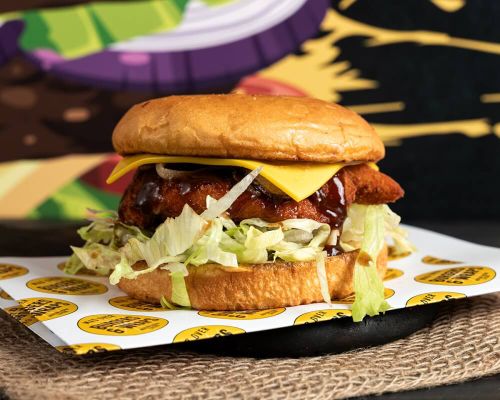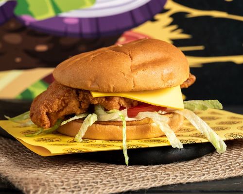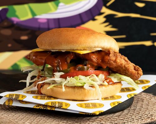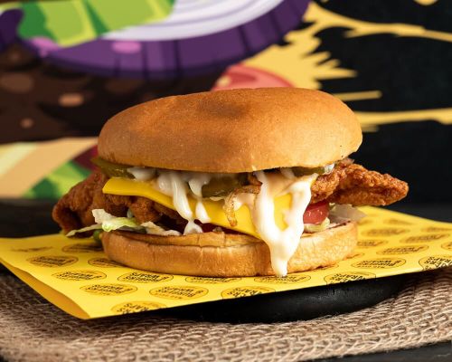 Crispy chicken, cheese, grilled onion, lettuce, mayo and barbecue sauce.