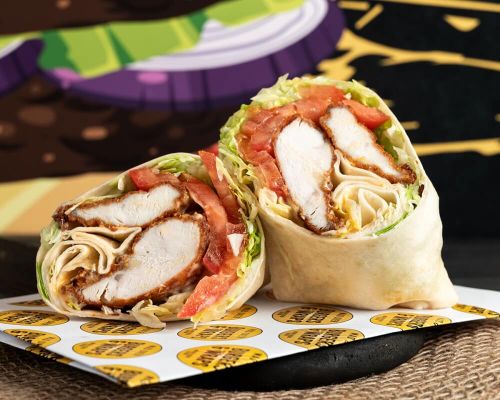 Crispy chicken fillet, cheese sauce, bacon, tomato, lettuce, ranch dressing and chipotle mayo wrapped inside a delicious plain tortilla