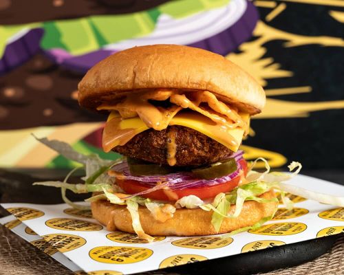 Mexican vegetable patty, lettuce, chipotle aioli, tomato slice, onions, jalapenos, and crunchy nachos.