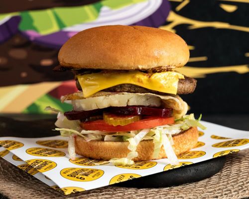 Homestyle Beef patty, cheese, mayo, lettuce, grilled onion, tomato, pineapple, beetroot, egg and bacon.