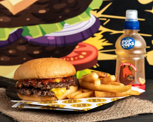 Cheeseburger with 1x smashed beef patty, Cheese slice and tomato sauce, perfect for kids. Comes with Chips and Popper.